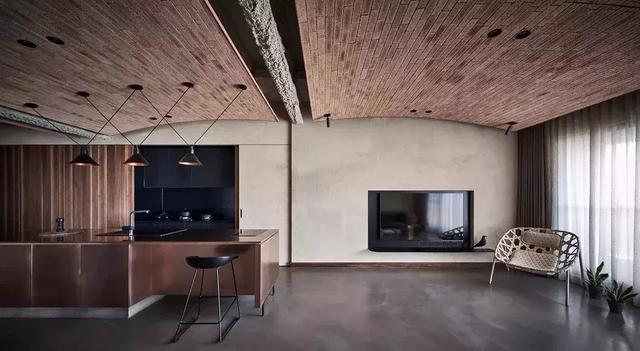 在主要的生活空間中,設計師們推出了凹形天花板面板,這些天花板面板在鋼梁之間平滑地拱起,營造出地窖般的氛圍。關鍵的是,拱形部分不會碰到橫梁,從而允許狹窄的空間用于通風管道的運行。