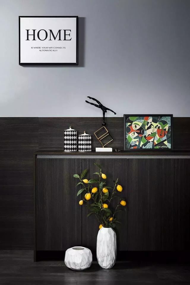暗木色系餐邊柜位于角落,果實(shí)樹枝讓冷色系空間多了一絲生機(jī)與活力。