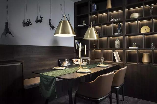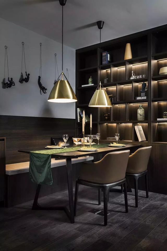 墻面上的雕塑藝術(shù)裝置,讓深色系空間多一份活潑。暖色調(diào)的燈光,營(yíng)造出濃郁的就餐氛圍。