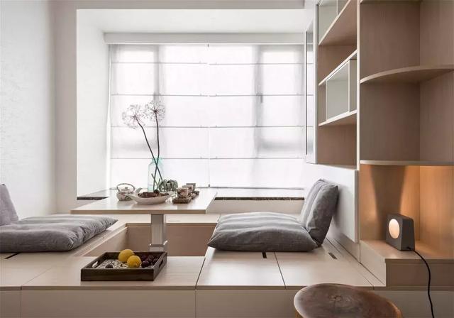 「脫離」老觀念,把次臥打造成茶室和臥室兩用的空間,做成榻榻米床。因為采光很好,業主的父母偶爾過來小住時,業主便可以陪二老喝茶聊天曬太陽,又可以留他們過夜休息。