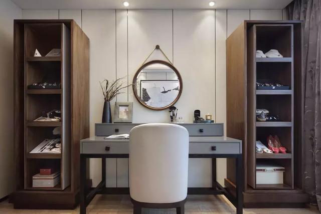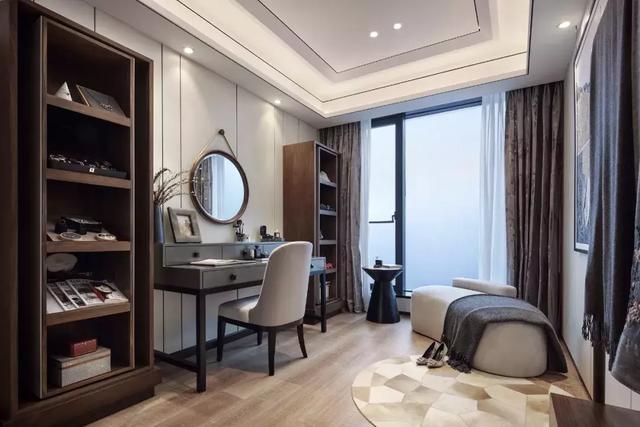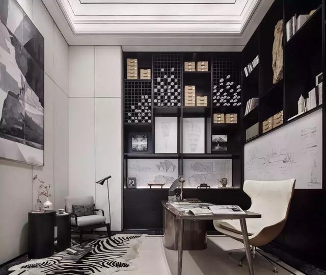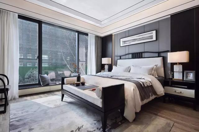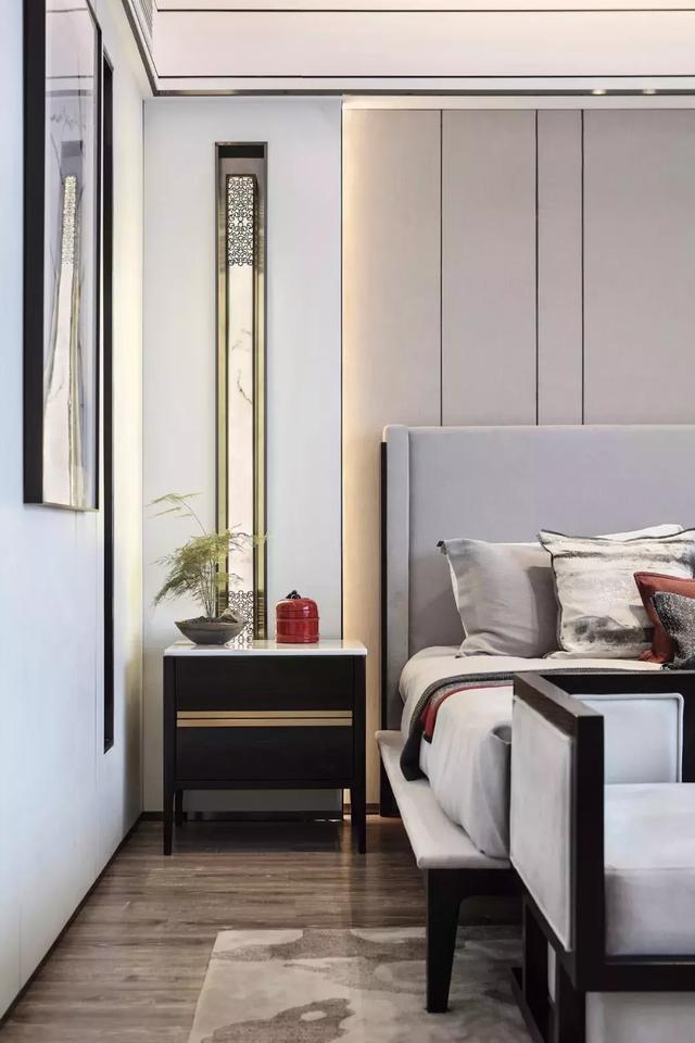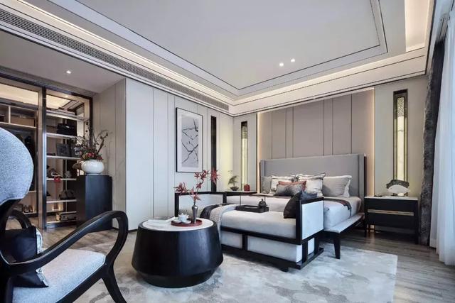 在臥室的設計上,設計師延續基調,用黑白灰三色將東方人對造型和空間的理解繼續擴延,“夢回明月夜,林杉響圓吭”,一束楓葉殷紅的色彩凸顯高貴的特質,黑漆實木邊柜與茶幾遙相呼應,將東方的美學演繹的更加國際化、現代化。