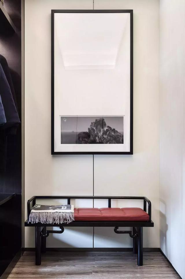 設計師打造的不是單一的休憩場所,更是一場藝術與文化的尋根之旅,方寸天地之間有小我,亦有大我。中式布藝床頭婉約秀麗,黑漆實木邊柜沉穩幽深,寫意的江水畫與周遭家具融為一體。