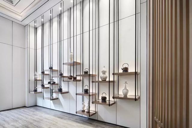 簡約內斂的白色與灰色無時無刻不在滲透著東方美學的典雅與寧靜,黑色線條編織的陳列柜與茶具經過燈光的折射,達到詩意與禪靜的升華。正如古代文人墨客“松下忘言對紫茶,全勝羽客醉流霞”的閑適生活,或細聞茶香,或茗辨人生,淺斟話收藏。