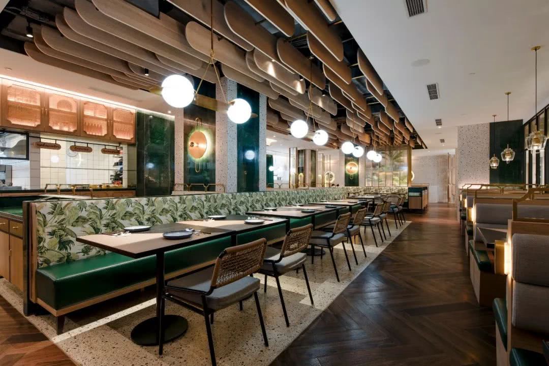 餐廳空間是一個規矩的盒子,平面布局通過一橫一縱布置了多重坐姿給空間帶來活力,給顧客就餐帶來了不同場景體驗。