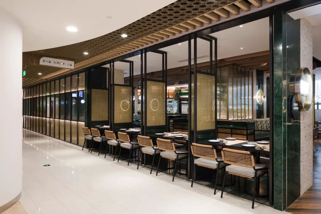 通過印度綠大理石、彩色水磨石、帶有熱帶風情的藤編、木地板、鍍銅金屬和陽光板編織出一個帶有普吉韻味的當代都市餐廳。陽光板和紗簾以及藤編的朦朧感給我們帶來了驚喜。