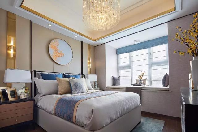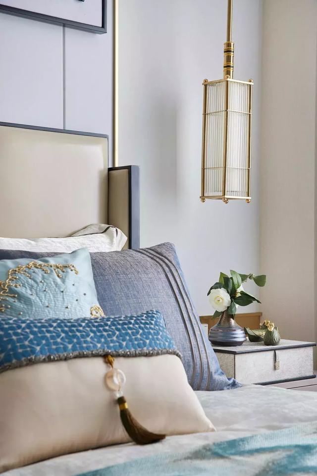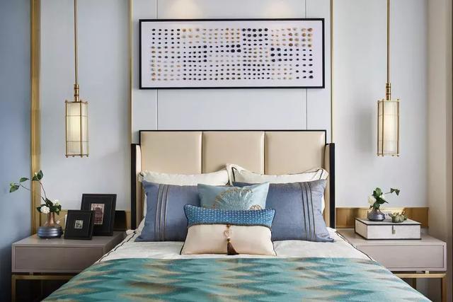 臥室整體色調(diào)以藍(lán)、綠為主,暖黃色的燈光自上而下調(diào)和著整個(gè)空間的冷暖對(duì)比,干凈、舒適又不失色彩。再配以金屬邊框和黑白的背景字畫,在不顯凌亂的基礎(chǔ)上,恰到好處的增加整個(gè)空間的層次感