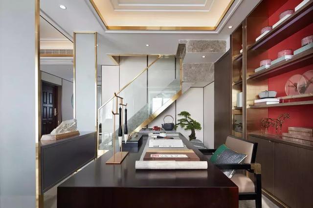 書房配以現(xiàn)代中式風(fēng)格的桌椅、書架,用以深木與代表中國的紅相結(jié)合,突顯了主人的涵養(yǎng)與學(xué)識(shí)。