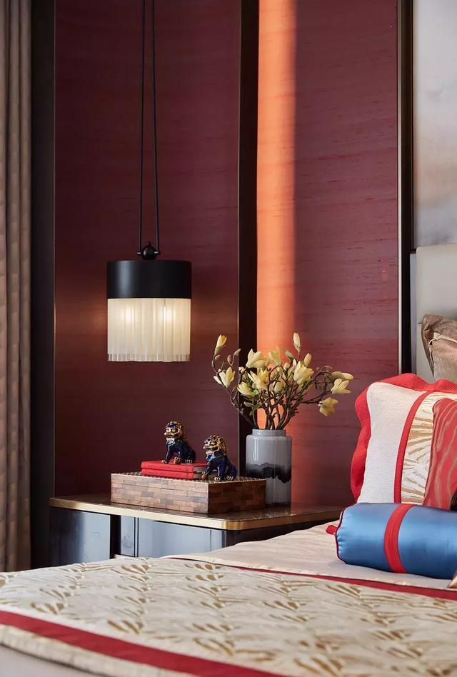 主人睡房讓中式人文中融入現代的元素,墻體稍作弧度,層次之美淋漓精致被展現,真絲壁畫遞增合意之感,赭紅色調,讓空間的神韻氣質在富雅中綻放