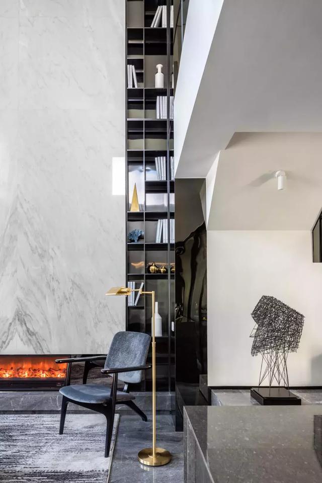 當體驗者身處客、餐廳區域時,層高為5.5米的挑高空間頓時帶給體驗者的是空間的開闊與震撼,其背景墻采用天然白色大理石獨有的天然紋路,通過精湛的工藝對紋手法,打造出一幅宛如江南煙雨縹緲的畫卷。而與現代感十足的壁爐完美結合,更是對冬季主題增加了溫暖與柔和。