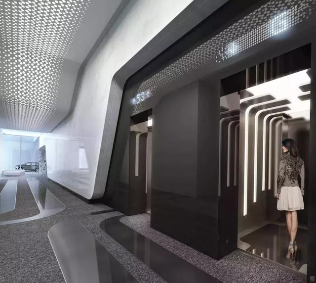 在這里扎哈設計了一個多面的金屬墻雕塑,延伸到天花板上的四邊。