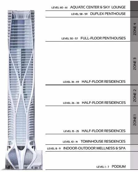 大廈的10 到 14 樓將包括聯排別墅形式性質的公寓。半層公寓將占用 15 到 49 層,50-57層為全平層公寓,復式閣樓將位于 58 和 59 層。