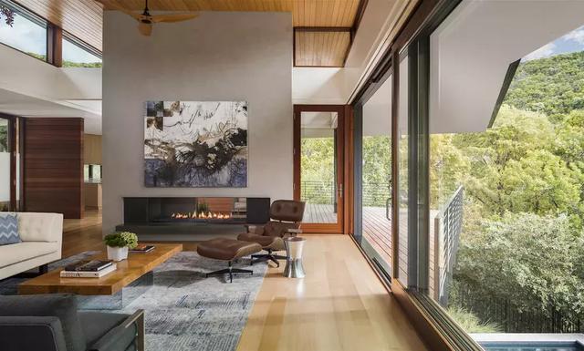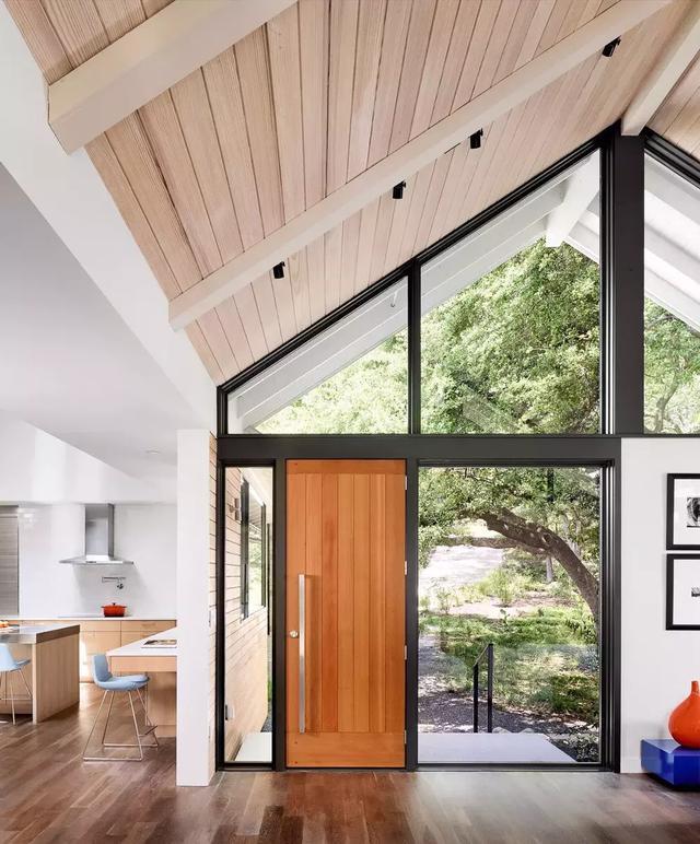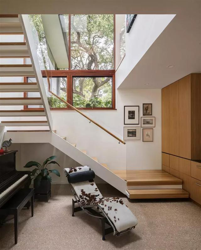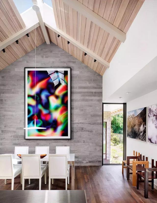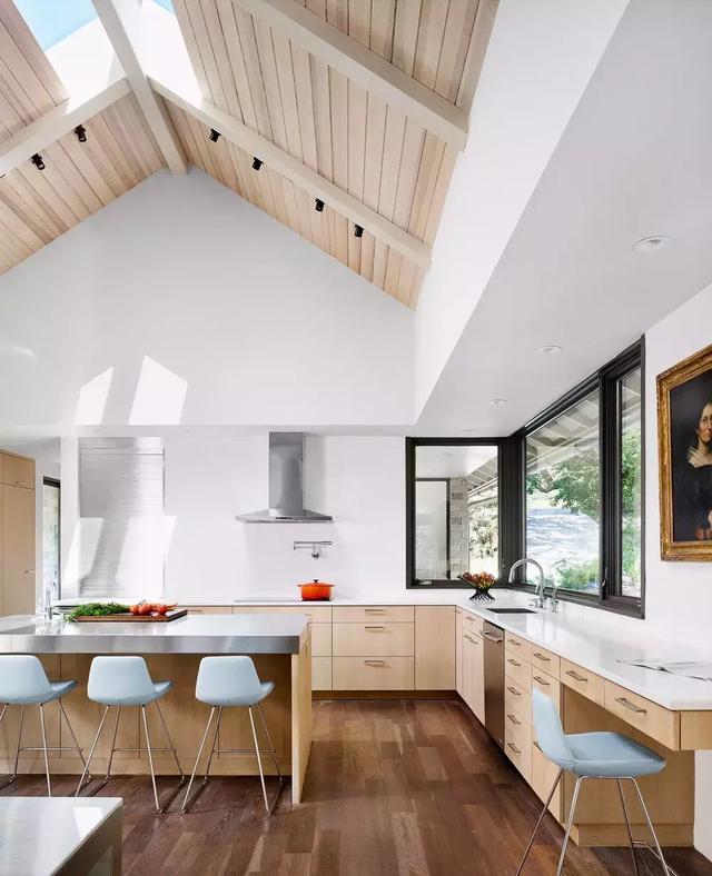 兩個相鄰的拱形空間分別設有山脊天窗,洗滌下方的廚房和用餐區,起居室的玻璃可以看到外面的樹木線。