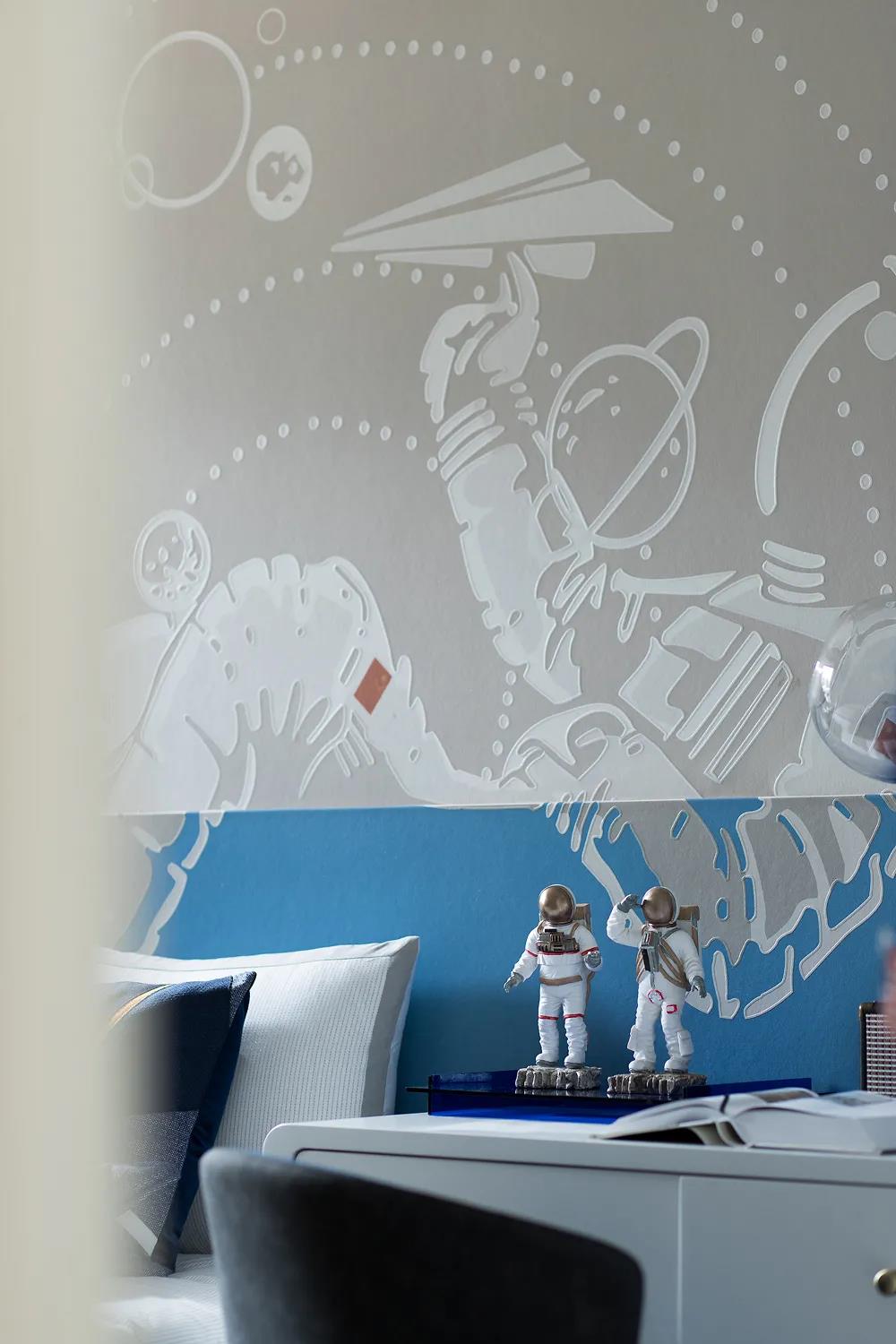 兒童房則與之沉穩的調性相反,大膽地用藍色與粉色區分孩童空間,大面積的主墻紙簡潔易懂得把孩童的喜好表達清楚,使空間躍動又富有設計感。在兒童玩樂區域上也花了不少心思,男孩的積木墻與女孩的泡泡池,既保障了游戲的安全性也充實了空間,使它保持溫馨、跳躍。