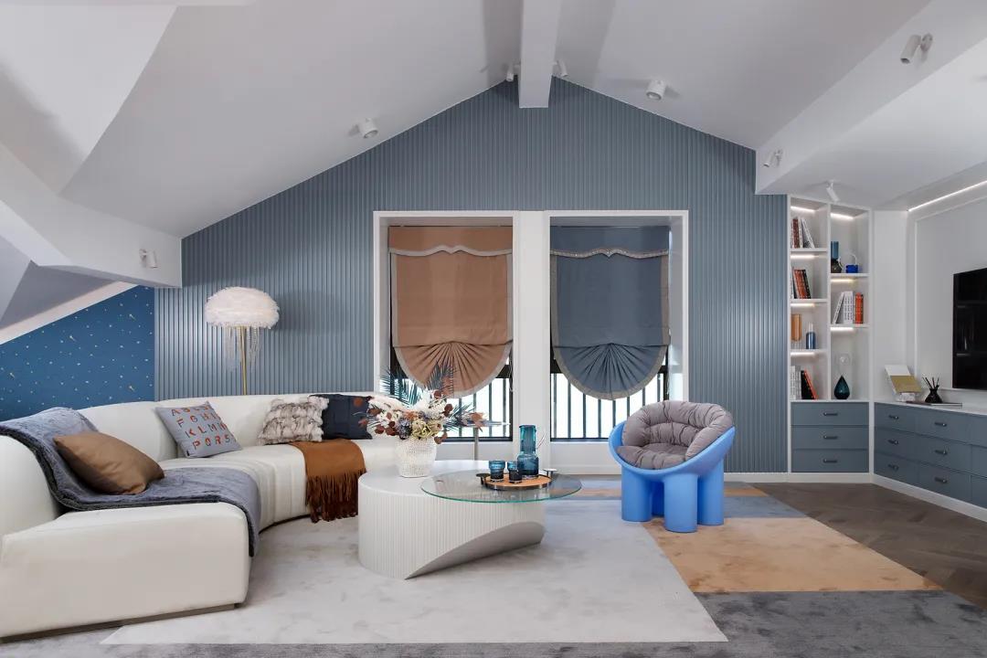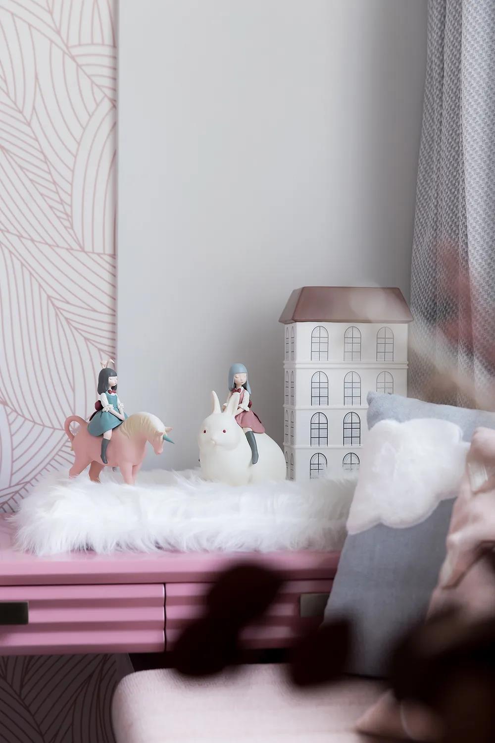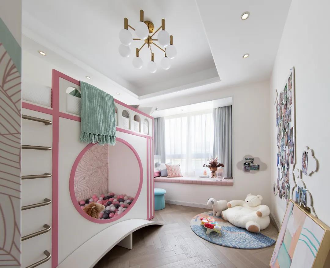 The children"s room is contrary to the noble tone. It is bold to distinguish the children"s space with blue and pink. The large area of the main wallpaper is simple and easy to understand to express children"s preferences clearly, making the space dynamic and full of design.A lot of thoughts were also spent on the children’s play area. The boy’s building block wall and the girl’s bubble pool not only ensure the safety of the game but also enrich the space, keeping it warm and jumping.