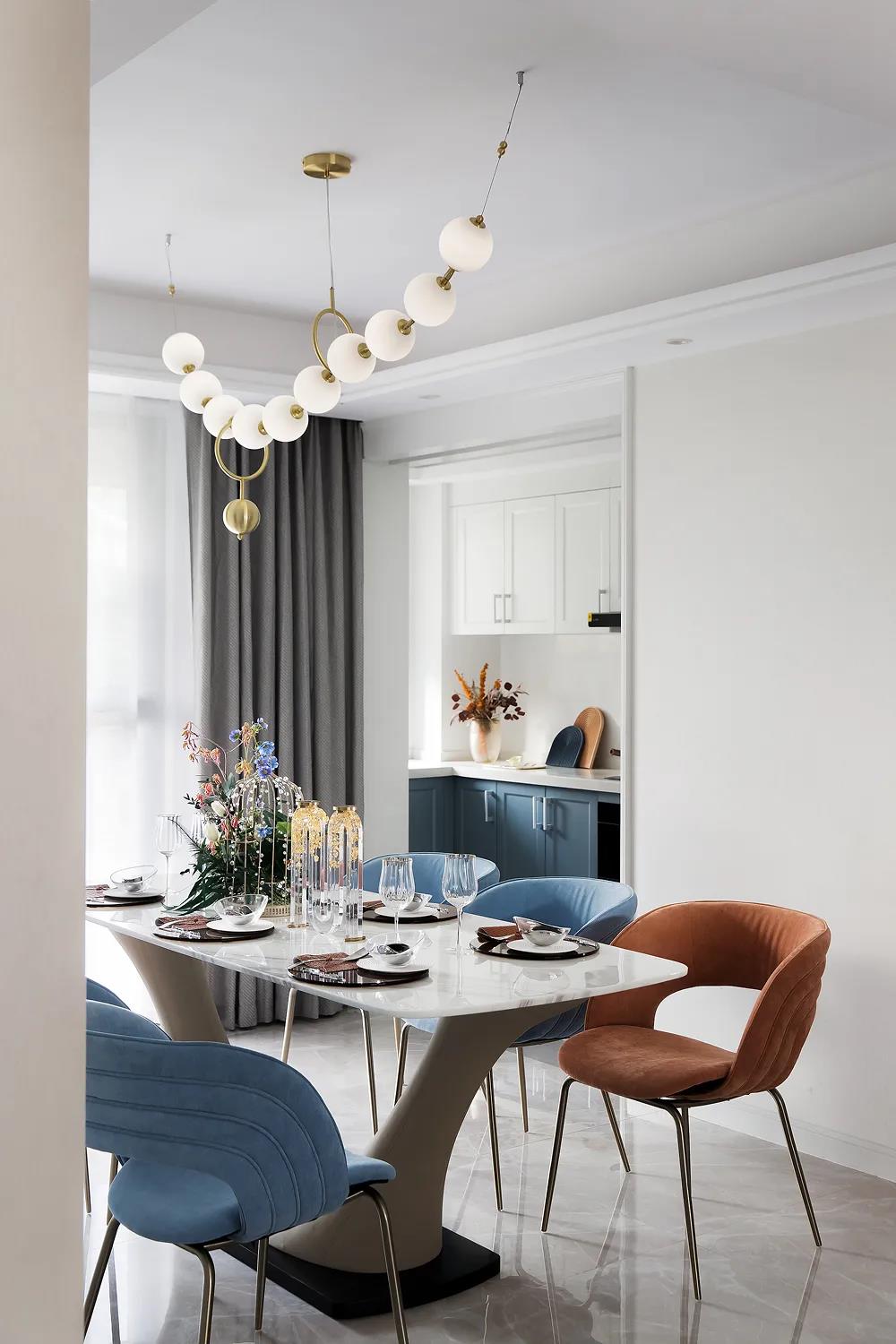 設計師并沒有用生硬的線條分割客餐廳區域,而是以一個矩形空間使人們的視覺自動劃分開獨特的餐廳一角,既保持了客餐廳一體的寬闊感,又使餐廳具備一定的私密性,家具的圓潤增添了空間的高級感與流暢性,營造出靜謐舒緩的居住氛圍。