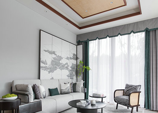 4、在別墅軟裝飾品搭配中,可以稱之為大件的主要有窗簾和地毯,這兩種布藝品的顏色對室內整體裝飾的效果有著至關重要的作用。而窗簾和地毯等大件軟裝飾品的顏色選擇,可以跟著室內裝飾風格走。比如,室內裝飾為工業風,可以選擇黑色、白色或者灰色的窗簾。窗簾的顏色確定下來,那么剩下的家中其他的裝飾品,如花瓶、抱枕、門簾等軟裝飾品的顏色要能跟窗簾顏色搭配。