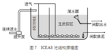 ICEAS工藝 ICEAS 即間歇式循環延時曝氣活性污泥法,與傳統 SBR 相比,最大特點是:在反應器進水端設一個預反應區,整個處理過程連續進水,間歇排水,其流程見圖 7。