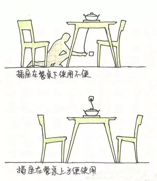 餐廳所兼具的功能較多,至少2-3個五孔插座才夠用。這里要提醒,不少人冬天吃火鍋,于是會想到裝一個地插,相當不好用,慎重安裝!
