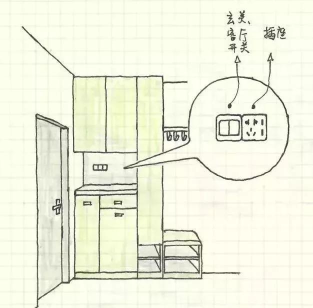 進玄關處要設計兩個開關,分別打開玄關和客廳的照明燈,快出玄關的地方要再裝個開關,關閉玄關燈。