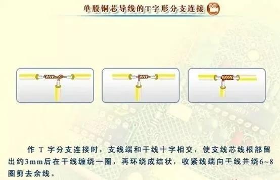 將支路芯線的線頭緊密纏繞在干路芯線上5~8圈后剪去多余線頭即可。對于較小截面的芯線,可先將支路芯線的線頭在干路芯線上打一個環繞結,再緊密纏繞5~8圈后剪去多余線頭即可。