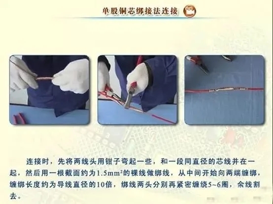 大截面單股銅導線連接方法:先在兩導線的芯線重疊處填入一根相同直徑的芯線,再用一根截面約1.5mm的裸銅線在其上緊密纏繞,纏繞長度為導線直徑的10倍左右,然后將被連接導線的芯線線頭分別折回,再將兩端的纏繞裸銅線繼續纏繞5~6圈后剪去多余線頭即可。