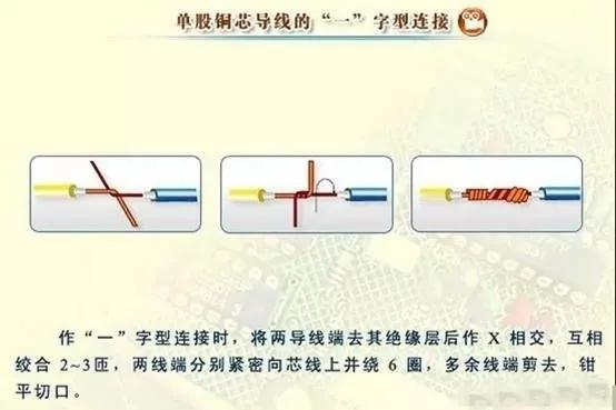 小截面單股銅導線連接方法:先將兩導線的芯線線頭作X形交叉,再將它們相互纏繞2~3圈后扳直兩線頭,然后將每個線頭在另一芯線上緊貼密繞5~6圈后剪去多余線頭即可。