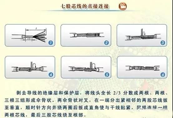 基本操作步驟:剖削硬線絕緣層、散開芯線、對叉傘形芯線頭、分組纏繞線頭、鉗平線頭末端。