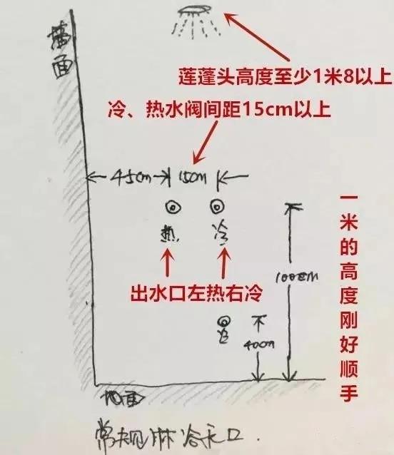 冷熱水,出水閥做在80-120cm的高度是最適宜的,間距15cm,不能有誤差!蓮蓬頭高度至少要比家里高的人身高高20厘米!水閥注意左熱右冷,距離墻面不能小于45cm,不然洗澡會撞到墻!淋浴房離地35-55cm范圍內(nèi)裝一個冷水口,以后裝上水龍頭方便接水!