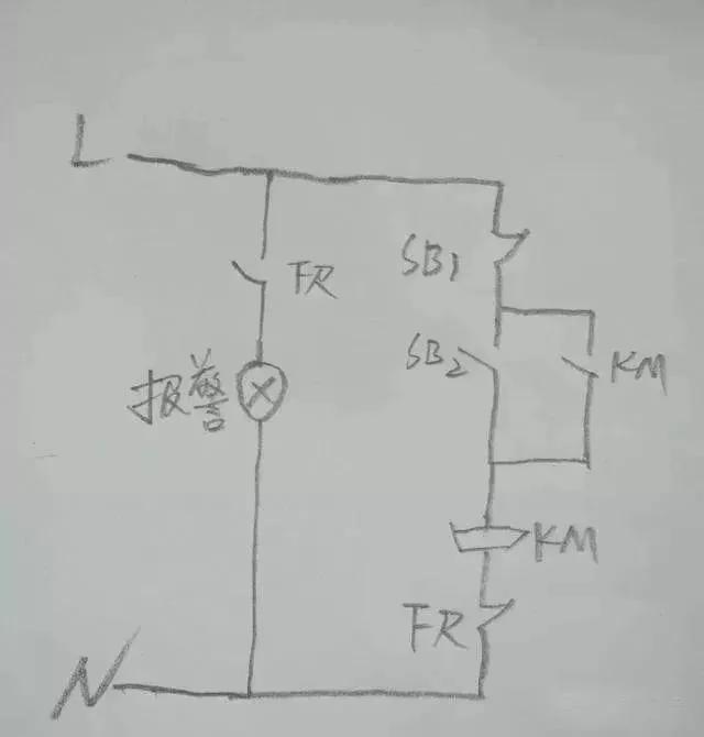 簡單描述一下這個圖。當電動機工作正常的時候,熱繼電器的常閉觸點接通,常開觸點斷開,報警裝置不工作。如果電機出現故障,熱繼電器內部的熱元件把常閉點斷開的同時,熱繼電器的常開點閉合,報警裝置形成回路,報警響起,提醒操作人員及時檢修。