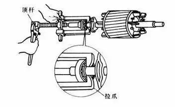 頂拔器俗稱拉具,分為雙爪和三爪兩種,是拆卸皮帶輪和軸承等的專用工具。頂拔器形狀和使用方法如下圖。使用時各爪與中心絲桿應保持等距離。