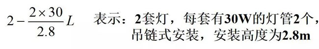 a :燈具數量 b:燈具型號 c :燈泡數量 d :燈泡容量,W e :燈具安裝高度 f :燈具安裝方式(X吸頂,B壁安,G吊桿式,L吊鏈式,R:嵌入式) L:光源種類