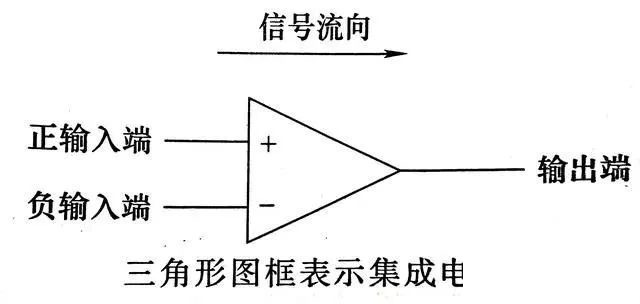 集成運算放大器、電壓比較器等,習慣上用三角形圖框表示。如上圖,其左側(cè)有正負兩個輸入端,右側(cè)三角形頂點處為輸出端,三角形圖框的頂點方向即為信號的流向。