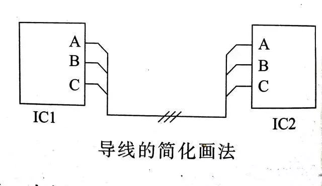 連接導線可以用簡化的畫法,如上圖中IC1與IC2之間的連線上畫有3道小斜杠,表示這里有3條導線分別將IC1與IC2的A與A、B與B、C與C連接在一起,而這3條導線之間并不連接。