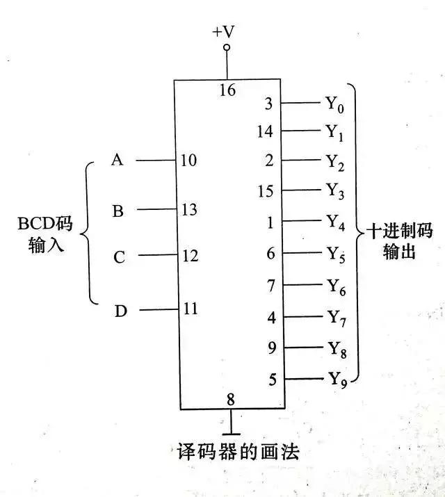 如上圖所示,集成電壓放大器、集成功率放大器等,既有用三角圖框表示的,也有用矩形圖框表示的,但放大器采用三角形圖框表示,信號流向更直觀。數(shù)字集成電路一般采用分散畫法,直接用邏輯圖形符號表示,門電路、觸發(fā)器等,都采用這種畫法。其他數(shù)字集成電路,目前仍然較多的采用矩形圖框來表示,并在各引腳處標注出該引腳的邏輯功能文字符號,如下圖中的譯碼器。