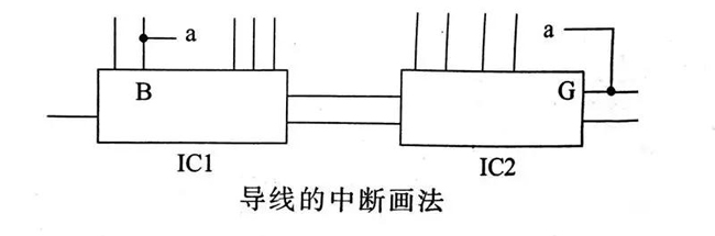 當連接導線的兩端相距甚遠時,中間相隔較多的圖形區(qū)域時,可以采用中斷加標記的畫法。如上圖,IC1的B端與IC2的G端之間的連接導線采用了中斷畫法,并在中斷的兩端標注有相同的標記“a”,當我們分析電路圖時,就理解為兩個“a”端之間有一連接導線。