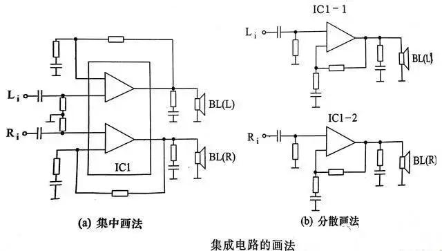 某些元器件包含很多獨立單元,尤其以集成電路為多,如上圖中的雙功放集成電路,圖a為集中畫法,圖b為分散畫法。一般來講,較簡單的電路多采用集中畫法,較復雜的則采用分散畫法。