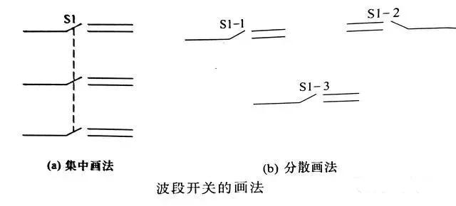 有些元器件包括若干組成部分,在電路圖中可以根據(jù)需要采用集中畫法和分散畫法。如上圖:波段開關可以如圖a集中畫在一起,并用虛線相連表示聯(lián)動;也可以如圖b,分別將它們畫在它們控制的電路附近,并用文字符號“S1-1”“S1-2”“S1-3”表示。