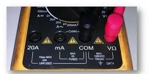 (1)將黑表筆插入COM插孔,紅表筆插入mA插孔中(最大為2A),或紅表筆插入“20A”中(最大為20A);(如圖8所示)