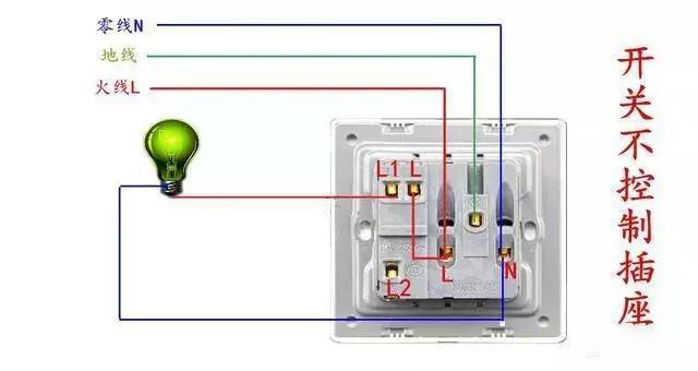 一開五孔:開關即控制插座也控制燈,零線進插座的N,同時并聯一根零線去燈上面,讓燈和插座同時得到一個零線。