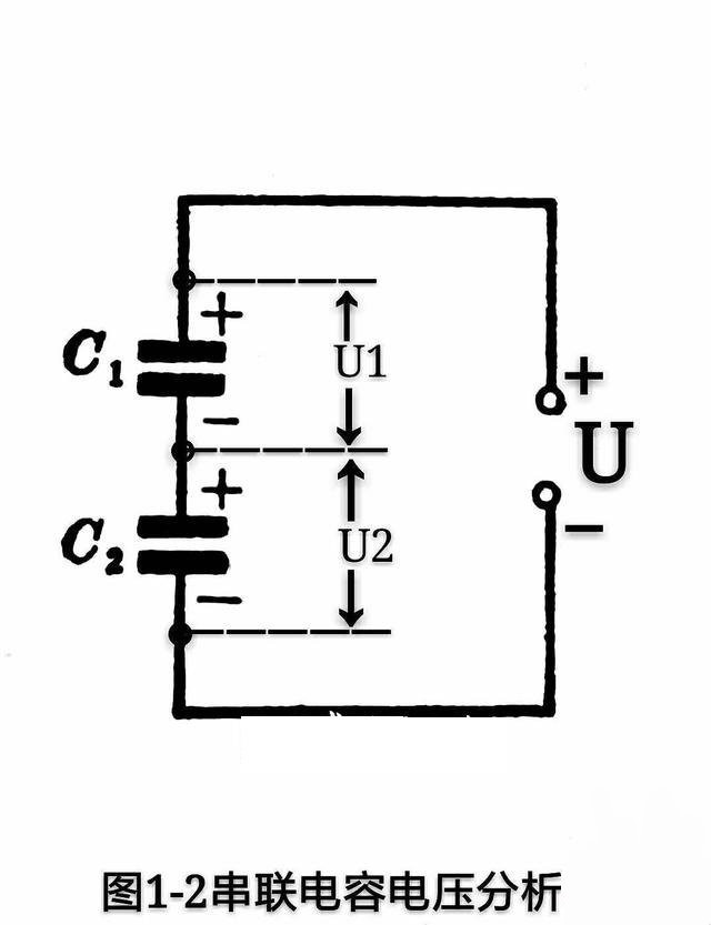 從圖1-2所示我們來分析直流電源電壓U=U1+U2,這里需要指出,即是標稱容量相同的電容器,它們之間也存在容量誤差,如果是不同容量的電容器串聯, 那么它們之間的實際電壓值是有很大差別的。