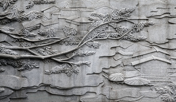 3、沉雕。又稱"線雕",即采用"水磨沉花"雕法的藝術品。此類雕法吸收中國畫與意、重疊、線條造型散點透視等傳統筆法,石料經平面加工拋光后,描摹圖案文字,然后依圖刻上線條,以線條粗細深淺程度,利用陰影體現立體感。