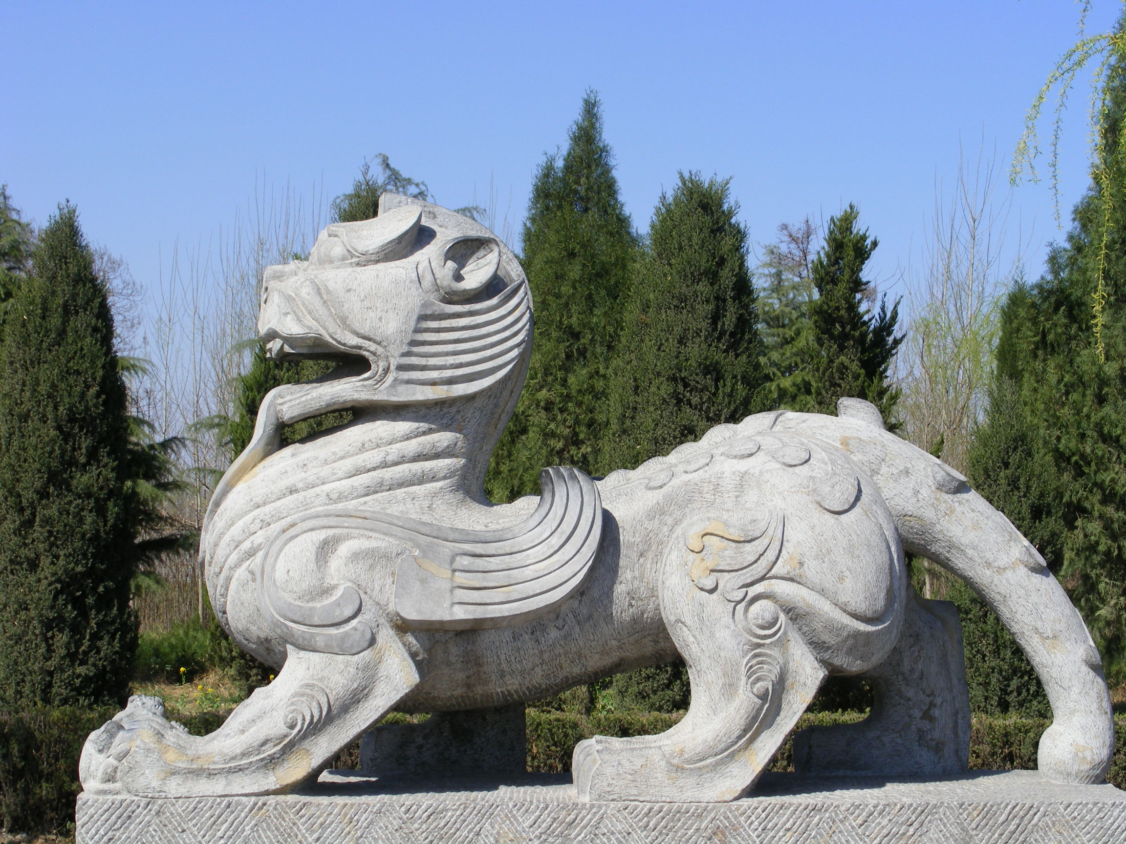 中國石獸雕刻中,石獅雕刻別具一格,制作量無計其數,裝飾用途廣泛,如皇宮、宅院、官衙、廟字陵墓和現代的大型商廈、賓館、酒樓大門兩側的石獅雕刻和橋梁、碑、坊的石獅裝飾雕刻等。石獅體態造型變化多姿多樣,如站、蹲、臥等,千姿百態,且常有地域性差異。