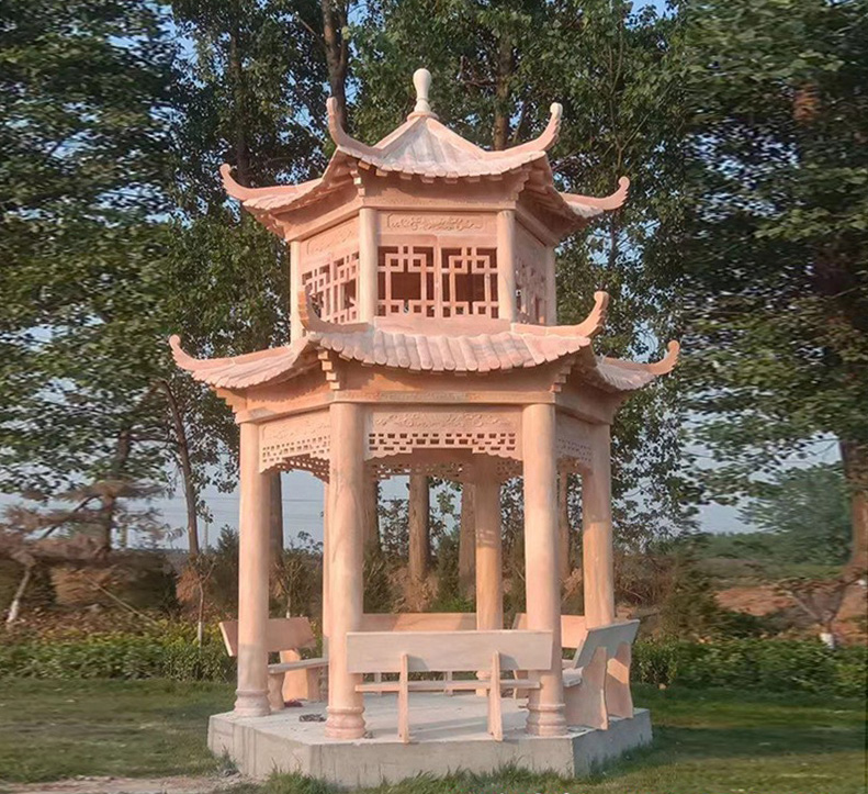 農村石雕涼亭的作品在現代的使用非常的多,像公園、風景區、廣場、休閑場所的空地上,隨處可見,可供人休息、游玩,還具有美觀、時尚、環保等優點,受到人們的普遍歡迎?,F在的涼亭 多以石雕六角亭雕刻為多,早期的涼亭多模仿木結構的做法,斗拱、月梁、明、雀替、角梁等等,皆以石材雕琢而成。