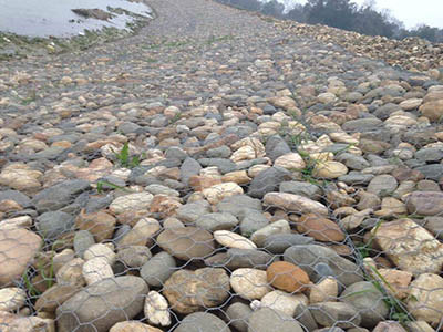 裝鉛絲籠卵石的堆積距槽邊不小于1.5米。鉛絲石籠卵石裝填施工時,兩人一組、一人碼砌一人轉移石塊,阻撓向籠體內投擲石塊,1m高的籠體為施工入便當,籠子上口應設置腳手板每側兩塊,籠體裝填完畢隨時移動。