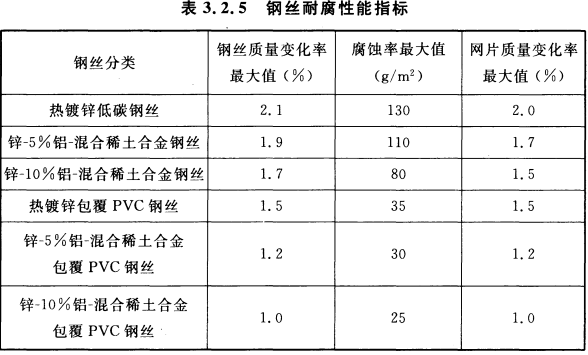 3.2.5 鋼絲鹽霧試驗應按現行國家標準《人造氣氛腐蝕試驗鹽 霧試驗》GB/T 10125 執行,鋼絲經過不低于 3000h 鹽霧型式試驗 檢驗,鋼絲質量變化率、鋼絲腐蝕率、鋼絲組成的網片質量變化率 不應大于表3.2.5 規定的數值;包覆 PVC 鋼絲經 2000h 鹽霧型式試驗,鋼絲腐蝕的滲透深度即平端深度應小于15mm。