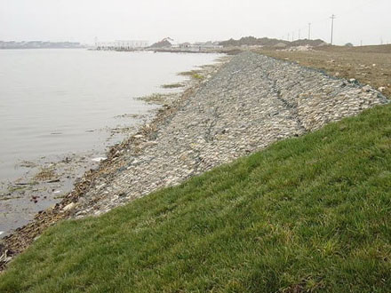 石籠網箱可用于護坡、護腳、擋土墻工程,石籠網箱結構的防沖系數要高于傳統拋石防護工程。受水流沖刷影響,石籠網墊內的塊石即使產生位移,變形后的箱籠結構會產生新的平衡,總體完整性不會遭到破壞。石籠網結構為柔性結構,箱籠內填石塊或其他材料存在一定空隙,風浪浪峰上拍時,浪花被粉碎,減少了浪壓的沖擊力,風浪浪峰退下時,因箱籠的空隙,不會造成真空吸力,降低了對防護工程的破壞力度,加之整體結構可在風浪力作用時自行微調,可有效避免墻身出現裂縫。