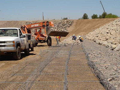 石籠網沉排操作,首先是將用鐵絲編織而成的石籠網沉排。也可以加上電鍍和涂上PVC(聚氯乙烯),PVC石籠網沉排也可用作護岸和趾部防護。石籠網箱(箱形石籠)。石籠網是使填石固定就位的鐵絲或聚合物絲的網格式制作物。鐵絲籠是由鐵絲編織的網格或是焊接而成的結構物。這兩種結構可以是電鍍的,編織的鐵絲箱可別的涂上PVC.編成網格的石籠比焊接的石籠柔性更大,因此習氣沉陷和荷載的功用是不同的,雖然填裝石材料要細心以確保將石塊填的很密實。