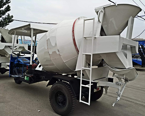 小型混凝土攪拌車 攪拌車組成:二類底盤、傳動系、液壓系統(tǒng)、機(jī)架、攪拌罐、進(jìn)出料裝置、供水系統(tǒng)、操縱系、人梯等部分。攪拌罐前端與減速機(jī)聯(lián)接安裝在機(jī)架前臺上,后端通過滾道由安裝在機(jī)架后臺的兩個托輪支撐。? |
