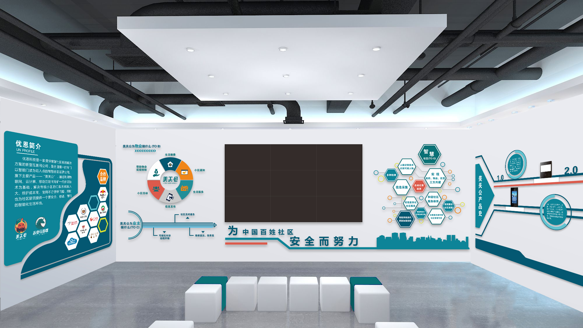 其次,除了這些顯著的展板,還有公司經營理念的標語和VI視覺布局,也是企業文化認同的表現,相當于企業文化墻的另一種形式。