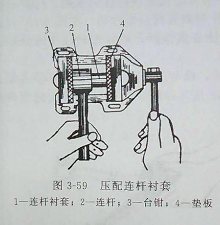 拆連桿襯套,用沖子沖出即可。安裝連桿襯套時,用沖子沖入或用臺鉗壓入(如圖3-59所示),有條件的地方,可在壓床上進行。安裝時,應注意使襯套的油孔與連桿小頭上的油孔對準。若新襯套上無油孔時,應在壓入前先將油孔鉆好。
